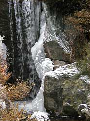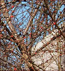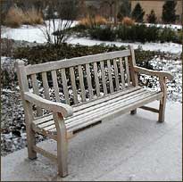 We were alone in this 79-acre Garden this morning. We neither met nor saw anyone along the paths. Even the "regulars" must have been worn down by the persistent cold and the cover of snow that blocks all hopes of spring. One catbird has somehow gotten trapped inside the Linnean glass house. I spotted it last week feeding on the red berries of an asparagus fern. Aside from those few berries, there is not much else to interest a catbird in this house of prize camellias. I wondered if the bird could survive until the days when the windows and doors again would be opened. The keepers of the house must have wondered too because we saw a generous spread of cracked corn mixed with crabapples on the ledge of a high window. Alongside the loose feed, there were some branches of beautyberry still filled with purple berries for the bird to pluck. This catbird will live to see the windows open again.The lake in the Japanese Garden is frozen and snow-covered except for a few spots where water bubbles up from the circulating pumps below. In those places the diminished lake looks like a basin fountain filled with water that silently and slowly falls from its brim. Long before the flowering quinces are ready to put their pink or red flowers out for admiration, I noticed that they usually rehearse by showing a few flowers deep inside their tangle of prickly stems. The road show usually begins this time of year. I looked for them this morning, but the month of cold seems to have delayed the show. Prunus mume: a Japanese flowering apricot is about to bloom. Within the week as the weather warms, the twenty-foot tree planted within two feet of a brick wall that faces South will be the darling of the Garden. The tree will glow with delicate pink blossoms that will send their sweet, spicy fragrance to lure walkers in for a closer look. I thought that the Garden keepers made this midwinter magic happen by taking advantage of the tree as they created a microclimate of shelter coupled with the slow release of nightime heat from the bricks. It turns out that protection and warmth only help the flowering apricot to do what it wants to anyway: bloom in the middle of winter. From the Brooklyn Botanical Garden I learned that the flower buds have a "staggered dormancy." As the inevitable freezes of winter pick off the first crop of flowers or buds, another crop begins to break dormancy; then another. Like ranks of Redcoats in the Revolutionary War, new crops of buds and flowers just keep appearing until the weather no longer kills.The snow started just as we left the Linnean glass house where the camellias have started to get serious about blooming. The snow was falling in chips rather than flakes. It was dry, airy, and quiet sticking easily to the paths and lawns. There were no walkers ahead of us so we had the privilege of being the first to mark the fresh snow. We paused often to look back. Ours were the only footprints that disturbed the white this morning. The Garden is filled with benches. In greener times, they blend inconspicuously into their surroundings. Now though, they cannot hide. I was especially interested in benches today because a catalog I ordered from a designer of garden furniture called Country Casual arrived yesterday. Some of the benches they are selling I felt sure I saw in the Garden. I took pictures of some benches in the Garden and then compared them with those in their catalog. A match. The Garden benches are in a style Country Casual grandly calls "Monarch." They are made of solid teak, a favorite in English Gardens. The catalog says that because teak is so waterproof, it was the wood of choice for English sailing ships. When wooden sailing ships gave way to steel vessels, some of the timber from the tall sailing ships was recycled into garden benches. Since teak is a tropical hardwood native to South Asia, Country Casual takes pains to let buyers know that the benches they sell are made from "ecologically harvested timber from countries with an official commitment to sustainable management of their natural timber resources. For every tree felled, more than one is planted to replace it." Gratifying, but not surprising since the Garden takes tropical conservation very seriously. Finally, the weather has been cold enough, long enough for ice formations to form on the falls in the Japanese Garden. The soft curves of ice meeting flowing water have formed a second solid falls to complement the flowing one. Can banana trees overwinter in Zone 6? The Garden keepers think so. The tall banana trees in the Chinese Garden that had a stock of still tiny green bananas when the first frost hit were cut to the ground and mulched with coarse wood chips. The mound of chips covering the stocks and roots is at least a foot and a half high. I'm anxious to see when the mulch will come off and whether there will be banana trees this year. Put it in the strange but true category: I overheard part of a conversation between two workers at the ticket counter. One remarked that it surprised her how many people came into the lobby, used the restrooms, and then left without buying a ticket to come inside. Another replied that she wasn't surprised at all because the restrooms in the Garden are among the cleanest and neatest in the area. "Yes but," the first went on, "A person would really have to be a restroom connoisseur to want to first find a parking place and then walk all the way from the lot to get inside." Finally: "Well, let me tell you, we're flush with connoisseurs here." We saw a hawk today, the first ever in the Garden. It was close, but it just stayed long enough to swivel its head before moving on. I knew it before we left for the Garden this morning. The frost ferns would be blooming this morning. With temperatures in the low teens and the wind chill somewhat less than zero, ice etchings would form on the windows of the Linnean glass house. I was right. They were there. Tracings like the plumes of feathers