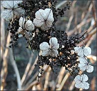 The garden keepers usually leave dried flowers on shrubs until late winter. The buff browns of hydrangea globes are so bountiful that individual balls never standout. It's just the opposite with the panicles of the Oakleaf Hydrangeas (Hydrangea quercifolia). Each of the elongated flowering stems has a shape, texture, and arrangement of blooms that makes it different from others on the same shrub. Shadows and contrast also come into play with small, dark, densely packed male flowers providing background for the stage-front females. Oakleaf Hydrangea flower heads are my choice for winter's most photogenic plant.