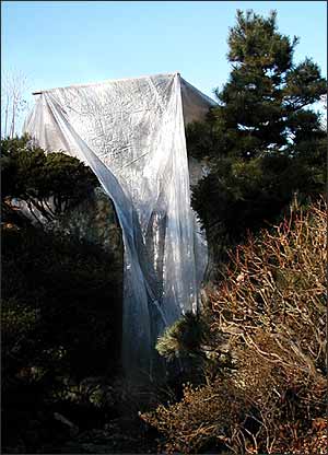The waterfall on the west side of the Japanese Garden has been turned off for many weeks. Mussels that lived in the still water below the falls are dead but still give off rank smells on warmer days. So that workers can do what needs doing to repair the waterworks during cold weather, a sheet of heavy plastic larger that I thought possible has been draped over the top of the falls and down the sheer cascade. Whether intended or not, the effect is like a Christo wrapping. The breeze blows the plastic from side to side and up and down. Air from the bottom billows the material to form a sail that bubbles away from the rock face. The "work" is like a miniature version of the fabric-wrapped cliff on the Australian coast that Christo and Jeanne-Claude did in the 60's. As I looked at the wrapped falls in the Garden from different perspectives and at varying distances, I can understand the words that Christo and Jean-Claude use to describe their work: "You see things you have never seen before. You also get to see the fabric manifest things that cannot usually be seen, like the wind blowing, or the sun reflecting in ways it had not before. The effect lasts longer than the actual work of art. Years after every physical trace has been removed and the materials recycled, original visitors can still see and feel them in their minds when they return to the sites of the artworks."