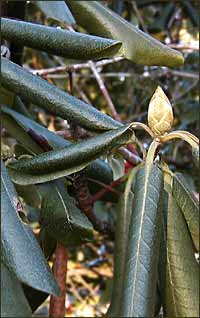 Flora says that 'PJM' and 'Nova Zembla' are among the hardiest of rhododendrons. I planted five 'PJM's' last August. Now I have an urge to get a couple more rhododendrons when spring comes, so I decided to see if I could find a 'Nova Zembla' shrub among the Garden's collection. I spotted one easily. It's a large shrub - about 5 feet tall and just as wide. The limbs open away from the center of the plant giving the shrub an airy open look. The tapered glossy leaves are deep green, but today the cold caused them to curl inward to protect themselves. Flower buds jut from the ends of the branches like candles on a Victorian Christmas tree. My new book shows that the flower balls that will emerge from the buds in late spring will be red with a suggestion of blue. I wonder how many other people use the botanical garden as place to preview plants before making a commitment to them?
