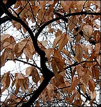 I must be among the few who hasn't read the Lord of the Rings trilogy. When I tell friends that I've started reading the books, they usually counter by letting me know that they read them "years ago." I thought of a passage in The Two Towers as I passed the great American Beech (Fagus grandifolia) tree at the entrance to the English Woodland Garden: "…they made their camp under a spreading tree…it bore many broad brown leaves of a former year, like dry hands with long splayed fingers; they rattled mournfully in the night breeze." The beech tree in the Garden spreads. Its papery leaves of seasons past amplify the winter wind. And this morning the dry leaves vibrate as they break the fall of raindrops. Even though I will never see that American Beech at night, I can image wizards and hobbits moving in after dark.