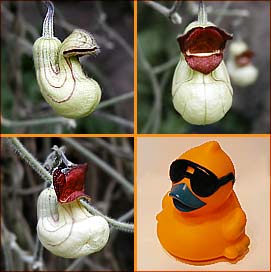 I see things differently. There is nothing serious or contemplative about these flowers. They are just funny. They cause people to point and laugh and take pictures. They seem cuddly. They are absurd. They make us want to take a few home with us and hang them from the blades of our ceiling fans. I give them a new common name "Rubber Duckies."