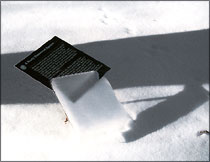 The snow cover is underpinned with a layer of ice. Yesterday the sun began to melt the combo, but then the temperature dropped again. The temperature drop must have been faster than I thought. The freeze caught a slab of ice-covered snow on a tombstone marker before it could slide to the ground. This morning the rectangular slab stays suspended unnaturally on the marker like one of those balanced rocks in a national park.