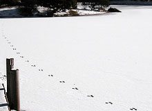 The 4-1/2 acre lake in the Japanese Garden is frozen deep and hard. Either most visitors never get to these far reaches of the 79-acre Garden or they heed the signs that threaten prosecution for those who don't "Stay Off The Ice" because with one exception, the snow on the lake is unmarred, unmarked. At the far end of the Lake though there are tracks where a lone rabbit hopped from the shore to an island rightly named for the hare's unlikely journey: Tortoise Island.