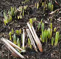 When spring does arrive, the Garden will welcome it with 65,000 blooms of crowd-pleasing tulips, daffodils, and hyacinths. With all the planting that went on last fall to get ready for the spectacle, it's not surprising that a few bulbs intended for spring never got planted. Now that the snow is gone, I happened upon a lobe of the bulb garden were I saw dozens of hyacinths bulbs that had been spotted for planting, but never planted. The bulbs had rested on top of the ground since fall. Now they are corpses. I wonder how it happened? I've seen how thousands of bulbs are planted on college campuses without error using a two-person team. One person digs a hole with a power auger; the other follows, placing the bulb in the hole and covering it. At this Garden, I think the bulbs must have been spotted by one team, and then at some later time buried by another team with no final check done by the keeper-in-charge.