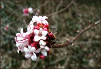 The earliest of the viburnums, a variety called "Dawn" (Viburnum bodnantense), has just started to bloom. The shrub is growing at the edge of the daylily garden along the east wall of the Garden. The viburnum's cherry-red buds open to fragrant, chunky star-shaped pink blossoms that cluster tightly at the ends of their bare branches. The funnel-like shape of the flowers seems oddly out-of-sync for luring hummingbirds or butterflies that a still months away. 'Dawn' is a hybrid that originated in a botanical garden in the 1930s - the Royal Botanical Garden in Edinburgh, Scotland - and then was rejected because the breeder there thought the hybrid wasn't much better than its parents. A few years later breeders at the Bodnant Gardens in Wales did the same cross. The breeders there embraced the cross, called it 'Dawn,' and named it "bodnantense" for their garden. And the moral of the story: the perfectionists are forgotten and the good-enoughs get the credit.