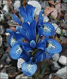 "Precious gems" they're called. In garden catalogs they're described as having "orchidlike beauty." As much as that sounds like catalog hype, I think it aptly describes the dwarf irises that are in bloom this morning. Sheltered from the west wind by the Temperate conservatory, a clump of Iris histrioides called 'Lady Beatrix Stanley' has popped into bloom in the rock garden. While only a few inches tall, the dwarf irises are not easy to overlook, even on a gray day like today. Unlike the other late winter bloomers that point their heads down when they bloom or that refuse to open until the sun shines brightly enough for their liking, the dwarf irises bloom boldly and unconditionally. Their blue blooms are upright with gaudy splashes of yellow and a radiating tracery on their falls. My bulb catalogs say all of the dwarf irises are fragrant. I'll not stoop to verify that.