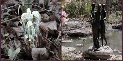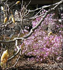 Pairs, clusters, and colonies are what give spring its dazzle. One-of-a-kind things are better left to a more solitary season. Spiked green pips of hostas dot expanses of dark mulch under the trees. Early specie-tulips crowd together like flowers in a centerpiece. Daffodils refuse to bloom alone. Even the woodpeckers and ducks now travel in pairs. ![]() The Royal Ferns (Osmunda regalis) just coming up at the edge of the Bog Garden are the most formal and elegant of all the groups of spring. Their crosiers are still sheathed in what looks like a translucent birth sac. They huddle with their crooks facing inward, none choosing to grow faster than the other does. They are a living counterpoint to the statue of The Three Graces by Gerhard Marcks that stands just a few yards away. Magnolias cannot be ignored. When they bloom, they command awe. Pink, purple, or white--they dominate their surroundings. As radiant as they are this year, I have seen how vulnerable they are to an early spring freeze. Just one night of freezing temperatures can turn their colors to brown and their silken shapes to pulp. Let any cold wait one more week until the magnolias have ended their reign.