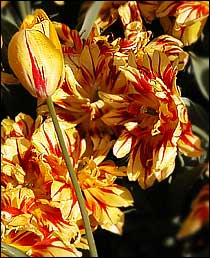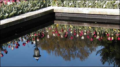 I arrived at about 8:30 a.m.- a half-hour before the Garden officially opens. The parking lots were already about half full. Florescent traffic cones had been put in place and men in vests that matched the color of the cones had gathered. Traditionally, Easter Sunday is the day many visitors make their annual "floral pilgrimage" to the Garden. But, anytime bulbs bloom in backyands and neighborhoods, crowds come to the Garden to get a super-sized helping of spring. The Garden keepers say that they planted over 84,000 bulbs this spring. Such large numbers start me thinking about even larger ones. I wonder if the Guinness Book of Records tracks lavish spring floral displays? People pose for pictures with flowering bulbs as a backdrop; they talk about the spring flowers that their parents or grandparents once planted and that still come up year after year. Children draw the stems of tall tulips toward them to sniff. People carry pencils and small spiral notebooks to help them remember the names of their best-liked blooms. I hear conversations with adjectives that range from "pretty" through "exquisite." Garden keepers have planted 128 varieties of new tulips. That is in addition to the many varieties of old favorites that were planted. With so much to choose from, I was curious about which tulip would be featured on the kiosk of plants in bloom. The kiosk, shaped like a garden cart, is just inside the doors that lead out to the Garden grounds. In it are about a dozen small vases. Each is filled with a sample blossom of some not-to-be missed flower. To help visitors locate the flowers, the kiosk has a map pinpointing the spot where each of the chosen flowers can be seen. The keeper of the kiosk chose to display a tulip called 'Monsella.' It is a muscular tulip, unkempt and flashy. It has shed every vestige of the shapely Victorian formality of the Darwin and Triumph tulips. It is a double tulip with petals that sprawl. When planted in a cluster, it looks like the scene of an accident with its yellow "Caution Do Not Cross" warning tape colored petals interrupted with red flames. My catalogs of spring bulbs tell me that the 'Monsella' averages three six-inch blooms per stem. They say it is long lasting and that it has that most unusual of tulip traits - a fragrance.The bed of 'Monsella' tulips is sprinkled with tulips that are shaped like tulips ought to be. Their stretched oblong heads are borne on tall stems. Their colors mirror those of the Monsellas - vivid yellows with streaks of scarlet. The bed of these bedfellows is unlike all of the Garden's other interplantings of tulips. Rather than using color contrast, this bed aims for camouflage. The Monsella's companion is called 'La Courtine.' An internet source says it was developed in Holland to be sold in France as a cut flower. ![]() Others were doing it, so I thought I would too. A bed of tulips mirrored in a reflecting pond is a picture not to be missed. A new vine has been planted on the arbor that had to be rebuilt after it was forced apart by a headstrong wisteria. Looking closely at this new vine, I noticed what looked like a serving platter of floral leaves with a cluster of green dots at the center. I thought I was seeing a thing that I didn't know existed - a vining euphorbia. It doesn't (as far as I know) and it wasn't. The tag on the vine called it Lonicera 'Mandarin.' It is a honeysuckle. But, this honeysuckle comes with a pedigree. It is a registered cultivar of the University of British Columbia Botanical Garden with the Canadian Ornamental Plant Foundation and the International Registration Authority. Impressive! It was developed in 1989 and first flowered in 1991. I learned that the dots of green that I saw in the middle of the lime-green collars is a cluster of flower buds that will splay into a bouquet of trumpet-shaped, mandarin-orange colored flowers. This new vine has some remarkable traits: it survives winters of -30F; it does well in sun or partial shade; it grows up to seven feet a year; it is a draw for hummingbirds; and it grows in almost any soil. Just one drawback for me: it lacks the sweet, heady, summery scent that enlivens most honeysuckles.Scent. None better than lilacs. They have just started to bloom. This week as I sniff my way through the Garden, I wonder why anyone would ever want to plant anything another other than a lilac. I know that in a another week their scent will be gone and their foliage will blend into the green and later they will all come down with a bad case of mildew, but for now, I drink deep and long. All winter long, the black sign that said Hosta 'Elvis Lives' pointed to a patch of empty ground covered with rotting leaves. I doubted The King. This morning, the King reappeared. Elvis indeed lives. |