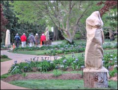 In a few weeks, an exhibition of sculpture made by the Shona artists from Zimbabwe will open on the grounds of this botanical garden. The show called “Chapungu: nature, man, and myth” will feature twenty-five stone sculptures depicting the animals, birds, people, and legends of Zimbabwe. Within the past week, sculptures mounted on sections of tree trunks have appeared. They are all wrapped, not because of the cold but to await the show’s official opening on April 28th. This botanical garden last exhibited works from Zimbabwean artists in 2001. Then, there were more works (67 in all) and a good many of them were monolith-sized. Compared with that show, this year’s show seems to be Chapungu-light. These new pieces, scaled for home gardens and patios, seem meant more to sell than to overwhelm.