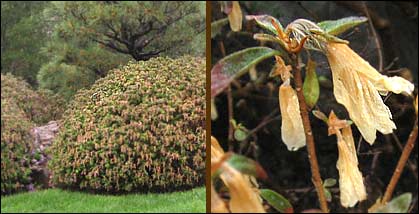 I wonder how this spring without color will affect revenues at the gate for this garden. Spring to a botanical garden is like Christmas is to a mall. This week the parking lot ought to be full. Busloads of folks escorted by their tour guides ought to be here today to see the reds, oranges, pinks, and whites of azaleas pruned to mimic pincushions. This year will be different though. Except for a few flowers blooming near the base of some of the more protected shrubs, the entire azalea display has been lost. The azaleas still have buds this morning, but they’re brown and papery, drained of color.