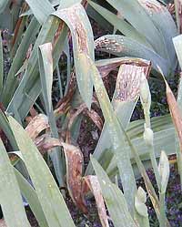Some of the iris beds have been infected with a fugal disease that I am guessing is iris leaf spot. According to a University of Illinois Extension bulletin, the disease begins with a pocking of irregular-sized spots on the upper half of the leaves. Then when the plant blooms the spots grow and coalesce into unsightly brown patches that “weaken the plant, cause aesthetic loss, contribute to general decline, and cause premature leaf death, which weakens the rhizomes or bulbs.” Bad luck: the bed of irises filled with the fascinating varieties bred by Brad Kasparek have been particularly hard hit. Last year they were newly planted so blooms were few. This year: the infection. I take comfort in that old saw about perennials: the first year they sleep, the second year they creep, the third year they leap. I wait, anticipating next spring.