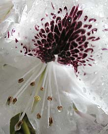 I’ve almost never look closely at azaleas. They color the landscape with lavender, orange, and red -- nice enough from a distance. This morning growing in the deep shade of the English Woodland Garden, I saw an azalea from distance that reeled me in for a closer look. The flowers were whiteeach a couple of inches across. They were arranged in a bouquet shaped like a pyramid. The lip of each flower looked though it had been tattooed with an elaborate fan-shaped design done in a deep purple. The sign near the shrub named the varity ‘Calsap.’ Checking the web, I found that the American Rhododendron Society gave ‘Calsap’ its Rhododendron of the Year Award for 2005 . Calsap is a vigorous grower and a late bloomer. The foliage tends to be thinner shadier spots, but who would cares about foliage when this azalea blooms?
