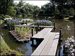 Lavender cotton (Santolina) is used as an edging for several of the beds in the herb garden. Most times the ground-hugging plant looks like a jumble of silver-white crawling things that could be dished-up to serve contestants on "Fear Factor." Never though do I remember seeing the Cotton in bloom. This morning all of the patches had sent up stocks of frothy lemon-pie filling colored balls of flowers. The combination of gold against a backdrop of silver lit by an early sun was dazzling.![]() The four-acre lake in the Japanese Garden named for "pure, clear harmony and peace" is neither pure nor clear this morning. A layer of algae rings the lake from the shoreline to about twenty-five feet out. Where the turbid currents of this green scum flowing in opposite direction meet, they form turbulent eddies. The conflicting currents bring to mind pictures of the cloud movements on Jupiter taken several years ago by the NASA's Galileo spacecraft. Visitors to the Japanese Garden from tour buses look, point, make mouth clicks, and say to their fellow travelers, "You would think they would do something about that." Having seen this great murkiness happen before -- late spring and fall are the worst times-- we know that it will pass. The wizards who manage this lake soon will turn the waters pure and clear again. Three weeks after the bearded iris finish blooming, the blunt-nosed Japanese Water Irises (Iris enstata) bloom. Beds of them line the zig-zag bridge that juts into the lake in the Japanese Garden. We crossed the bridge that jogs eight times before returning to shore to get a closer look at these once-a-year wonders and to evade the evil spirits that legend says can travel only in straight lines. |