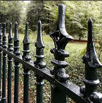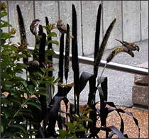 The stocks of the Ornamental Millet 'Purple Majesty' must be maturing: a treat for any sparrow that can find a footing. I think that if I looked back to some of the notes in my archive I would find a photo like this one. It's a photo taken close to ground level of a bluish succulent whose name I don't care to know. It's the thoughts spurred by close-up image of the plants, not the plants themselves, that grabbed my attentionCaladiums now fill the spaces emptied of tulips and daffodils. The keepers of the Garden don't take as much care in labeling caladiums as they do with spring bulbs. Caladiums seem to be here as placeholders to add summer color until the spring bulbs return to reclaim their rightful places. In my own garden, I also used caladiums to fill-in for some spring-blooming bleeding hearts that I knew would die back by summer. I decided to buy the bulbs I needed from a Florida grower called Caladium World. Originally, I planned to order a speckled small-leaf variety called 'Gingerland,' from them, but my wife nixed my choice as "too gaudy." She was right. The reds, greens, and whites on the 'Gingerland' leaves wouldn't stay put. The colors peppered themselves helter-skelter all over the leaf face. So instead we settled on the more orderly 'Frieda Hemple' with its all-red centers and borders of uninterrupted green. This morning though we saw a caladium that we both liked. It had a medium-sized leaf with a lance point, but was much narrower than any caladium leaf we had ever seen before. Most of the leaf has a camouflage pattern of olive shades. The ivory-colored center looks some Peruvian land drawing that only makes sense from the air. The odd caladium (if that's what it is) had no label, so I plan to send this picture to Caladium World with a promise to buy some if they will identify it for me.The spectacle of daylilies is less spectacular this morning. There are still plenty of flowers, but all the plants that are going to bloom have bloomed or at least started to bloom. So, it's again time to pick my Dozen Best. My choices are based on whim. I count neither buds, nor scapes, nor petals. I don't measure blossom size or the height of stocks. I don't care about how long the blooms last or whether the spent blossoms look like a glass of day-old beer. For about a month now I've been picking a couple of my favorites each week. I didn't look at the picks I made last year or at the lists of national daylily societies. I added a daylily to my 2004 list because of all the daylilies blooming on that morning, I most wanted to take a picture of it. So, here is the list and the pictures: my Dozen Favorite Daylilies of 2004. As it turns out, none of my picks were in the top dozen or even the top two dozen of the American Hemerocallis Society's most popular varieties. However, I did check the Society's lists of major award and medal winners. Five of my twelve picks took top awards: 'Bess Ross,' 'Etched Eyes,' 'Red Rum,' 'Sabine Baur,' and 'Green Flutter.' (That's not remarkable though because the Garden is loaded with medal winners.) Only one of the daylilies I picked this year was on my top dozen list of 2003: 'Acquire the Fire.' Now that my 2004 list of favorites is finished, I'm ready. With list in hand, I plan to take on the crowds who will be at the botanical garden's two big daylily sales next month to try to get some of my picks for my own garden. The iron fence around the grove of trees that shade the mausoleum where Henry Shaw is entombed has been removed for nearly a year. Many parts of fence and some ornate finials that topped the fence were rusted, corroded, damaged, or missing. We thought the old fence that had been protecting the mausoleum grounds for a century had been scraped and that a new look-alike fence would replace it. Today the fence was back. So was the man who brought it back. He told me that except for the rails that were rusted too badly to be saved, the fence and finials are original. Slow, careful restoration and lots of galvanizing allowed the fence to be saved. Fence and finials dressed in very formal, dark green enamel look splendid.We took all of the plastic flats and gallon containers that we got when we bought bedding plants and perennials to the Garden's Horticultural Recycling Center. We were not the only ones to recycle. The Garden reported that in 2003 they collected 30,000 pounds of horticultural plastic and a total of 275,000 pounds since opening their collection site a few years ago. The pots are made into high-density plastic lumber that the Garden sells as 2" x 6" x 8' planks and as raised bed kits. |