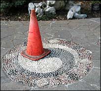 Pebble mosaics of plum blossoms, birds, and tree peonies are prominent features of the flagstone walk in the Chinese Garden. At the place where the walk divides, there is a mosaic of a yin-yang symbol. This morning for no reason that I could see, someone had put an orange danger cone at the point where yin meets yang. In a Chinese garden where everything has symbolic meaning, I wondered what I was to infer about the perfect balance of all things today.