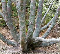 In the Chinese garden the bamboo, the pines, and flowering plum trees are the three "friends of winter" either because they stay evergreen or bloom before winter has ended. I've often looked at the bamboo and I always visit the Chinese Garden in early February to look for the first fragrant blooms of the "plum blossom." (Prumus mume). Until today though, I never noticed the third friend - the pines. I should have. There are two unusual, rare pines in the Chinese Garden: the Lacebark Pine (Pinus bungeana) and the Himalayan Pine (Pinus wallichiana). I first noticed lacebark pines at the Dawes Arboretum near Newark, Ohio. There they are behind a fence to keep lovers from carving hearts and arrows on their attractive barks. The barks of lacebark pines are mottled with random patterns of quiet burgundy, olive drab and brown much like camouflage fabric. The tree has a cluster of trunks that begin together and then spread up and out.