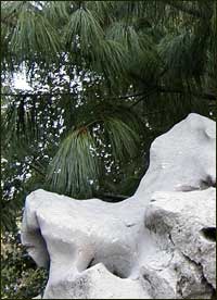 I didn't notice the bark or the trunk on the Himalayan Pine. On this tree the needles grabbed my attention. Tufts of eight-inch needles, more blue than green, dangle from the ends of every branch. They arch and droop giving the tree a shaggy yak look. The Himalayan Pine is planted just behind a Tai Hu stone as if to soften the hardness of the rock.