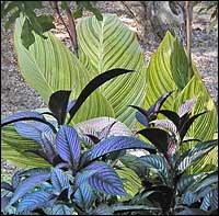 We arrived as a twenty-foot high balloon in the shape of a ripe, red tomato was being inflated. Later this morning, the tomatoes judged prized by their growers will be judged by others less biased. The grower of the best tomato wins $5000. People have strong feelings about cannas. To some they are too tall, too brassy, too gaudy, too red, too vulgar, and too old-fashioned. On top of that, their faded flowers won’t shrivel-up and drop off to make way for new blooms and their leaves often are riddled with insect holes. To others, cannas are ideal plants because they are easy to grow, long lasting, and they come in a variety of colors and sizes. From being fashionable in Victorian times to being loathed for most of the 1900s, cannas have become fashionable again as Northern gardeners begin to use them to mimic the look and the bold colors of the tropics. Cannas are on the upswing at this botanical garden too. Some are used as tall center pieces. Some serve as accents in beds of short, brightly colored annuals. Among the cannas used as accents, my favorite is a variety called ‘Pretoria’ or ‘Bengal Tiger.’ I can’t even remember what color the flowers are on the ‘Pretorias.’ The leaves are what count. They are marked with undulating stripes of greens and creams. Each leaf is also edged with a thin border of maroon. I noticed that the border color is clearest and deepest when the newly emerging leaves still are curled into a spiral. The ‘Pretoria’ cannas planted in full sun are at least eight-feet tall and still growing.