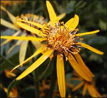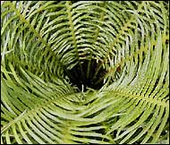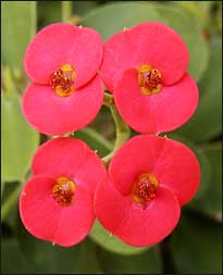 It never occurred to me. I've heard of using supermarkets, bars, gyms, and continuing education courses. But botanical gardens? The Atlanta Constitution has a column that they call "Second Chances." In it they publish notes from people who missed a chance to connect with someone they encountered, but were too shy or hesitant to approach. Here's a recent note from Second Chances: "To the woman with the beauty mark and wearing a red/white/blue-striped top and jeans last night at the Chihuly exhibit at the Botanical Gardens: not sure if you noticed me - you were taking lots of pix (well, so was I), but I sure noticed you. I kept coming across you several times during the evening, but I didn't have the nerve to bump into you. 5' 8" guy wearing a green plaid shirt and navy shorts. While waiting in the line for the shuttle, I wanted to walk back to you to say hi, but I was with a friend (platonic), and didn't want to be impolite. Hoping for a chance to finally say hi." I like dewy mornings. Without dew, spider webs are barely visible. With dew, they frost the tops of all the hedges. I thought of a spider web as I looked into the basket-weave vortex of a palm that I saw growing inside the Linnean greenhouse.Except for an arbor that my grandfather used to grow grapes that he turned into wine, the rest of his sizable yard was used to grow barberry. He grew both the green and red varieties, but preferred the reds because his customers were willing to pay a premium price for them. Once his plots were established, he never bought seeds. As kids, it was our job to pick the seeds from the prickly plants, and then, when my grandfather felt the pods had aged enough, we would all gather around a card table to pry the seeds from their shells. Remembering those earlier days, I knew barberrys were never stingy about setting seeds. But until I read a note in Horticulture, I didn't know the seeds were causing trouble. The magazine piece is titled "Beware the Barberry." It says all varieties of the barberry set far too many seeds that birds then eat and spread willy-nilly. This morning I looked at two separate plantings of barberry (Berberis thunburgii) in the Garden. I expected to see gobs of reddening seed pods. I saw none. Either the Garden keepers have stripped them or the plants planted here are sterile. Since the piece in Horticulture says that sterile varieties are "in the distant future," I guess the plants that grow here have been fixed. For most of the year the clump of Liglaria (Ligularia dentata) growing in the deep shade of the English Woodland Garden goes unnoticed. Despite its unusual leaves that remind me of a kid's first stab at making a paper airplane, the plant looks frowzy. This morning though the Ligularia has bloomed. Now it sports elegant flowers with slender golden petals that radiate from a coffee-colored pincushion centers. Maybe if the flowers bloomed along a highway in bright sun with sunflowers and black-eyed susans, they might go unnoticed. But here, such blooms in these deep shadows turns frowzy into high-spirited exuberance. I'm glad I got to see Cinderella at the ball. The colors of certain flowers are arresting. The colors seem fresh and new. They haven't been co-opted by Land's End or Old Navy to be made into t-shirts. They exist only to add color to the petals of one specie of flower. One such color is the color of four bracts of the Crown of Thorns (Euphorbia milli) that was blooming today in the temperate greenhouse. Books describe the color as "pinkish-red."or "soft salmon-pink." I would rather not give it a name.