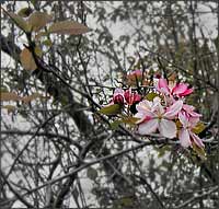 Autumn daffodil (Sternbergia sicola) the sign says. The flower, as yellow as a daffodil with the spear leaves of a daffodil is poking out of the limestone cover in the rock garden. Unlike a daffodil though the flower seems to open and close with the sun much like the goblets of crocus blooms. And sources I looked at say that the open flower resembles a daylily more than it does a daffodil. Technically, the flower is an amaryllis but I think that fact ought to be kept under wraps. Calling it an Autumn Daffodil makes an ordinary flower special.Mosquitoes everywhere. Thick jeans protect my legs; a light jacket over my tee shirt takes care of my arms. Undeterred, the bugs go for my face. Three landed on my cheeks before the palm of my hand landed on them. The mums are here. The lush, overgrown displays of summer have been ripped out to make room for what are sure to be yellow, rust, and salmon mums when their buds open. Many of the tight-budded plants were put in a week ago. By next week, they ought to begin to show. For most of the year, hummingbirds are elusive. Seeing a bird is mostly a matter of chance. September though is different. With so many migrating birds stopping in the Garden on their way South, a sighting is certain anywhere that salvia grows. The birds avoid the varieties with dense stocks of flowers and head instead to types that widely space their tubular flowers along their stems. There is a patch of intensely blue salvia (Salvia guaranitica) in the bulb garden that they especially like. Perhaps it's because they can shuttle between mining the flowers and perching on a nearby Hawthorne tree. In that one patch of salvia, I saw six birds in about five minutes. I took several pictures, all of which show blurs or tiny dots that only I would recognize as a hummingbird. The sawtooth oaks (Quercus acutissima) that border the fountain in the entry plaza are brimming with acorns. The acorns are fully-grown, but still are green. Unlike the sleek, no nonsense acorns of most of the street oaks I usually see, the cloche-like caps of sawtooth oak acorns envelope the nuts with a tangled mop of stringy fibers. When the nuts brown and drop in a few weeks, they are sure to become souvenirs for many Garden visitors despite a caution in a new Garden guide urging strollers to leave with empty hands and pockets. Until this morning I had never seen a crab apple bloom in the fall. I followed a hummingbird to an old crab apple tree in the bulb garden and saw the bird hover beside a patch of pink. When the bird lost interest, I moved closer. The tree was speckled with tufts of pink-white blooms. Unlike other nearby trees, this crab had few fruit and even fewer leaves. Perhaps the aged tree will die before the other crabs bloom again. So it blooms now, one last time.Twice in widely separated parts of the Garden I saw a shrub that I had never seen before. Along the garden wall behind the daylily garden, the small shrub was blooming in a shady spot among a collection of honeysuckle. The shrub had no identifying label. Learning from a nearby sign about honeysuckle, I guessed that the shrub was a part of a family that included honeysuckle and viburnum. To be part of the clan, a plant had to arrange its leaves so that they were across from one another and it had to have all of its flower parts attached to the top of its ovary - "a small green egg or ball." I checked the unknown shrub - Yes on both counts. It belonged. The second time I saw the shrub I was looking at an ornamental peach along a wall at the edge of the vegetable garden. Glancing to my left, I saw the same shrub. Now planted in full sun it had morphed into a small tree. It was bristling with creamy white flower spikes and was labeled Heptacodium miconioides. When I got home I did some checking.Heptacodium, also known as the seven-son flower, arranges its flowers in clusters of seven. As one source put it, "Although its name may be slightly unattractive, it has all the ornamental features necessary to be a prized, useful, and well accepted landscape plant." What excites growers about Heptocodium is that it is a three-act plant. It opens in late summer with plentiful, long-lasting, fragrant flowers. When the flowers fade, the seedpods and sepals turn maroon so that the shrub looks as though it is blooming again right into November. Then for its finale, Heptocodium stripes off ribbons of its bark in winter. Now that the drama has begun, I can hardly wait for Acts II and III. I was on the grass looking at an Amur Cork tree when a brown hawk flew no more than ten feet over the asphalt garden path in front of me and then veered off into a grove of holly trees. I thought of that hawk when I saw a couple of fugitive dayflowers (Commelina communis) growing up through the strip of peonies in the Japanese Garden. Dayflowers are rare in this Garden. Keepers seem think of them as described in an extension bulletin "a pretty weed that can quickly take over a garden" and so prefer to pull them, not encourage them. The peony leaves hid most of the foliage of the dayflower I spotted. Left only was a flower in flight. |