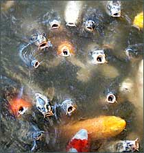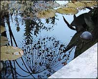Steam rises from the movement of water in the fountains and collects in puddles. In pools where the water is still, the reflection of the plants on the surface is bright and undistorted. The hard morning light and the intense blue sky sharpen the edges of the leaves and stems outlined on the water. The reflection of an arching umbrella-cluster of a papyrus plant potted in the middle of one of the ponds is like a starburst of fireworks. I went to a baseball game this week. From seats in the upper deck, I was close enough to watch as foul balls headed toward the lower level. A foul ball always meant a scramble to see who would the lucky one to take it home. Whenever a ball approached, a knot of fans would gather at the point they figured the ball would land, nudging and shoving each other to get into the sweet spot. This morning Pat threw some pellets of fish food to the koi. Heads up.Just a month ago, the ducks looked dull and disheveled. Molting, I guess. This morning we saw a row of five wood ducks perched at the edge of the water. They had been transformed. Markings were crisp; colors were deep and pure. Feathers were sleek and held close to their bodies. These are the ducks that will bring colors of festival to the grays and browns of the coming winter. Dozens of swifts were sky diving at the west end of the lake in the Japanese Garden. Occasionally, one would skim the surface of the lake and then veer up as though not cleared for landing. I never saw any of the birds land. Hummingbirds, especially in the fall, do feed and then perch. Swifts never seem to touch down. I had never seen so many swifts romping around the same piece of sky so I checked web to find out why. The Missouri Conservationist says that what I saw was a family group of chimney swifts. This family will join other families to make a flock of thousands that will migrate to Peru for the winter. Odd seeing swifts today just after reading a vignette about swifts written by the 18th century naturalist Gilbert White. He claims that because he was the first to "regard these birds with no small attention" he discovered that swifts "tread, or copulate, on the wing: and I would wish any nice observer, that is startled by this supposition, to use his own eyes, and I think he will soon be convinced." White observed that the "amorous act" took place in the May as one bird landed on the back of another and then with loud shrieking calls, they dropped as if hitting an air pocket. "This," he wrote, "I take to be the juncture when the business of generation is carrying on." The delicate language of Gilbert White and the grace of swifts in air fit so well together. Add another tree to my "worried about" list. Last week it was a crab. There are many crabapples in the Garden, but only two Flowering Apricot 'Peggy Clarke.' They are special because they bring pink blossoms to any lull in late winter. It is not unusual to see their pink flowers open when the daffodil leaves are just poking through their bed of mulch. Most of the leaves of the 'Peggy Clarke' planted in front of the wall of the education building of the Climatron are curling and drying. Too soon for fall and unlikely because of lack of water. Losing this tree means losing the first inklings of spring. Let it live.
