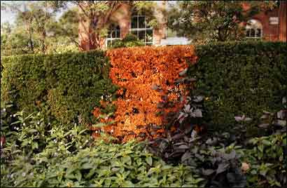 The berries of the Amur Cork trees (Phellodendron amurense) are turning a dark blue-black. Sources say that even after ripening, the clusters of dark berries will stay on the tree all winter. Maybe in some worlds they do, but here in the Garden the ripe fruit is a favorite of robins, doves, and squirrels. The concrete walk leading to the Rock Garden is splattered with inky colored spots from berries loosed from above and then crushed by walkers and the wheels of the touring tram. The freshly squashed berries have a musky citrus smell somewhat like those solvents and cleaners that add orange scents to mask their petroleum-like fumes.Each May, the Garden hosts a "Rose Evening." Members sip wine and take meandering walks along grass paths lined with newly opened roses. I never miss it. But, I think roses and September are a better match. The roses have gotten over their first flush of bloom, endured a fallow summer, and now have come back, lush and full. A coincidence: last night I happened to look at the web site of The All-America Rose Selections (AARS) and saw their pick for the 2005 All-American Rose. This morning I saw a single bloom of that same rose in a display of "Plants in Bloom" in the visitor's center. The rose is named 'About Face,' and I found a plot devoted to them in the rose garden south of the Linnean glasshouse. Like new models of cars, announcements of AARS winners run a year ahead to allow time to promote the new models. The AARS describes 'About Face' as "a very novel 'backwards' bicolor whose light color of deep golden yellow is carried on the inside of the petals with a darker bronzy orange-red backside. This super-vigorous plant yields long stems with full old-fashioned blossoms that catch attention throughout the life of the bloom. The flowers, up to five inches in diameter, offer a mild fresh apple fragrance and are beautifully complimented by lush, clean green leaves." ![]() Looking at 'About Face' is one of those "How did they do that?" experiences. When I saw them, I thought of Steak 'n Shakes' new "Side-By-Side" milkshakes that vertically layer two colors and flavors in the same glass. 'About Face,' especially as it is just opening and when it is seen up close is just as unsettling. It's not hard to image them entering the floral trade as trendy boutonnieres or as petals in the baskets of flower girls. Symbolically, 'About Face' combines the red of ardent love with the yellow of infidelity making it the perfect flower for the many marriages that will end in divorce.