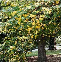In other years, the serviceberrys are among the first trees to fall color. This year though it's the Katsura trees. Up close the pattern of color change is like a pointillist painting. Round leaves, some green, some bright yellow, dot the tree, up and down, in and out. In this morning's light breeze, the tree looks like a one of those shimmering signs used to lure people into used car lots.Color change on the Katsuras (Cercidiphyllum japonicum) means that the leaves begin to release their scent. Stay down-wind of the trees and you will smell what some say is burnt sugar, caramel, toffee, or cotton candy. Others say the scent is more like ripe apples or fresh strawberries or cinnamon toast. My favorite description for the scent of Katsuras is a stodgy quote from The-Tree: "A noteworthy peculiarity of this tree is that the leaves, when freshly shed, give out a smell of freshly baked cakes, as if they had just been taken out of the oven. Alas I have never experienced this myself, but I've been told that this makes it possible for a human nose to locate the tree even in dense growth." Since the sweet smell of the Katsura can be just as anyone wishes it to be, I say that it smells like a chocolate bar just after the foil wrapper is pried opened.
