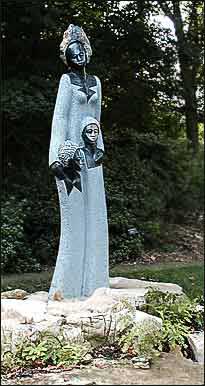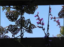 Just after entering the Garden we saw a young man walking alone. He seemed to be doing more gazing than walking. We talked. He said that he and his girlfriend were visiting the city for the weekend and that the reason for his early morning visit was reconnaissance. He told us he planned to return to the Garden with his girlfriend later today. But now, his mission was to find the perfect spot to ask her to marry him. In that best of all Garden spots, he hoped she would say "yes." He didn't ask us for advice and we offered none. We wished him well as we walked on. I wonder what spot he chose? I thought about the spot I would pick if I were going to propose. For sheer beauty, I would bring my chosen to Arbor of the Plum Wind in the Japanese Garden. We would sit down on the bench under the arbor overlooking the life-sized bonsai pine fronting the lake and I would pop the question. Still, the Arbor of the Plum Wind is a long walk from the entrance to the Garden. Tired legs and pinched feet might not help my cause. A better choice, just yards from the Garden entrance would be the lovely Victorian wrought iron bench at the East end of Linnean House. With our backs to the embossed figure of a partly unclothed Roman goddess, taking in the powerful aroma of the fragrant olive trees, who could say "no" ? Topiary has never been a feature of this Garden. The only examples I've been able to spot are a few shrubs that I think are arborvitum or yews formally planted to mark the points of a square. The shrubs have been clipped to simple spiral. I would guess that this Garden has little interest in or money to spend on high maintenance Edward Scissorhead-like creations. But as an attraction, few things would grab the eye like a topiary clipped into peacock or a person. Imagine the number of photos visitors would take of their friends sideling up to a life-sized herd of boxwood rams or a yew clipped to resemble St. Louis rap sensation Nelly.My favorite place to see topiary is the Topiary Garden in Columbus, Ohio. There done in sculpted deep green yews are about 80 topiaries that mimic the figures in Georges Seurat's impressionist painting "A Summer Sunday on the Island of La Grande Jatte, 1884." The pond in the park is meant as a stand-in for the River Seine in Seurat's painting. Free floating yews in the pond are clipped represent the passing boats in the painting. Recently I've noticed that colorful varieties of Swiss chard have joined kale and ornamental cabbage in the Garden's fall plantings. Near the entrance court to the Garden I spotted a big-leafed burgundy colored chard accenting a fall planting of primula and bi-colored sage. The crinkled leaves had a tropical look as the morning mist added an iridescent sheen to their distinctive shading. After leaving the Garden, I stopped at a small parking lot plant shop to buy some pansies and was surprised to find even they were selling some very pretty lemon-yellow ribbed chard as late-season ornamentals.Most viburnum berries are favorites of birds and squirrels. Few berries ever get a chance to turn red or purple before they are picked off. Tea viburnum (Viburnum setigerum) is a exception. Critters seem to take no notice of their hanging clusters of bright orange-red fruit. Like winterberries, the fruit of the tea viburnum lingers until spring.I wondered whether the leaves or the berries were used for tea. Poking around the web, I learned that the shrub is native to Mount Emei, a 10,000-foot mountain in the Sichuan Province of China. The mountain is the highest of four mountains that have been sacred to Buddhists since the first century. From the base to the summit are dozens of Buddhist monasteries. Some 300,000 tourists, pilgrims, and nature seekers now visit the mountain every year. According to a Fodor's guidebook, the walk to the summit is an easy two-day walk. Along the trail are hundreds of small shops that sell soft drinks, snacks, and walking sticks, and souvenirs. Walkers are warned to stay clear the mountain's golden monkeys that aggressively beg for handouts. Visitors with less time or energy can take a minibus, then a cable car to the top. Biologically, Mount Emei is a wonder. Britannica calls it "a paradise for botanists." With climates that range from subtropical to subalpine, the mountain has some 3,200 recorded plant species representing a tenth of all the plant species in China. The mountain is also a birder's destination and home to the endangered lesser (red) panda. Back to the Tea Viburnum. Turn of the century plant explorer "Chinese" Wilson reported that he found that Buddhist monks on Mount Emei dried the leaves and used them to brew tea. As I pass the tea viburnum this winter, I'll think of a mountain above a halo of clouds and monks in saffron. At one end of the wooden flat bridge that crosses the lake in the Japanese Garden is a coin-operated machine that dispenses fish food. Visitors put their money in and out pops a small handful of food for the open-mouth koi that look up at anyone who looks down at them. Regulars to the Garden ignore the machine, preferring instead to bring their own sacks of dried bread crumbs. Today as on other mornings, I noticed that an earlier visitor has kindly left behind a few bread crumbs arranged like a row of ducks on the bridge railing - a gift to those who come later and a snack to koi already well-fed.I haven't seen the telltale wrappers of spring bulbs, but I know they have been planted because pansies have replaced summer flowers in most of the large display gardens. For many years now the Garden has used pansies to add color to mild winter days and to fill in the gaps between mass plantings of tulips.