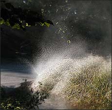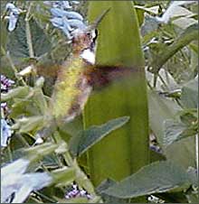 Aside from the pansy invasion, other preparations are being made for winter. This morning I noticed that the miniature palms accenting the entrance to the Linnean House have been taken away. Most of the smaller fountains already have been drained and cleaned. The once vibrant colors of the water lilies blossoms are fading as their sagging petals touch the water. Morning visitors have begun to wear light jackets. Some even appear with gloves, hoods and stocking caps. All that's needed are the fall colors on the trees. Aside from a few nut trees that seem eager to turn yellow, drop their leaves, and get on with winter, the color on the other trees is still a week or so away.Weeks ago I thought I had seen the last of the hummingbirds. By now, they all ought to be settled into a climate where tubular flowers bloom in December. The solitary hummingbird bird I spotted today seemed less active on this chilly morning. It had ![]() staked out a still flowering salvia. Occasionally it would make forays to the flower to feed or to chase away a bee who thought it had a claim to the flower too. But mostly, it would just sit on the upper branches of a nearby shrub. I watched it run though a list of things hummingbirds apparently do: it preened its wing feathers; it rubbed its beak along the sides of a twig as through the beak was a weapon that needed periodic sharpening or cleaning; it darted its long tongue out (was it really a tongue? do hummingbirds have tongues? anyone know?); and once in a while it dropped specks of white from its behind. Why is this hummingbird still here when any day now a frost will wipe out the tubular blooms of summer. The English Woodland Garden is my favorite place to look for flowers that thrive without the sun. Today in full bloom in deep shade-odd flowers with odd names: Turtlehead (Chelone obliqua) and Toad Lily (Tricyrtis hirta). Turtlehead, I get. Each plump orchid-colored flower perched at the top of a woody stock does have the look of a wizened turtlehead, especially when seen from the front. Looked at from the side the flowers look like a school of hungry koi. The Toad Lily is not as obvious. It's a speckled flower, reminiscent of a passionflower. The blossoms appear on long arching stems that poke out of nodes where the leaves wrap around the stems. This is a flower that could benefit from better public relations. Get it a better name, and it could begin showing up in bridal bouquets. I was startled to see a freshly tilled plot in the Kemper Garden that was sprayed with orange florescent paint to mark the placement of yet to be planted plants. On one of the sections, "No Plant" had been sprayed on the raw earth. How differently gardening is done here from the way I garden at home. From planning through cleanup, I garden alone. I decide what to plant and where to plant it. I make my own schedule for what gets done and when. Here, gardening is done by a team of specialists.Team members sometimes must communicate with one another only by florescent paint markings on the ground. It must be an efficient way to get beautiful, predictable results. To visitors like me the flowers that will bloom in this plot will smell just as sweet as mine will. But after seeing what I saw today, I hope that each of the people who did a their bit to create those lush blooms will feel as much satisfaction from their work as I do in mine.The annual "Best of Missouri" arts, crafts, and food festival has claimed big chunks of the Garden today. We got to the Garden before the sun did to wait in a good-natured line until the 7 a.m. opening. Volunteers and staff parade along the sides of the line plucking out "contributing" and "sustaining" members from us "regular" members. The favored ones are marched into a favored line to be led in first. Last year, all members were treated to a glazed "Krispy Cream" donut and coffee. The coffee is back this year; but, instead of a donut, we are offered slices of meaty bakery bread. Sheltered by white tents, sellers offer herbs, wreaths, jewelry, garden sculpture, and lots of food samples waiting to the stabbed by toothpicks. Foods with hot flavors are prominent this year. Pat introduced me to what she said was fashionable party dip - a cocktail cracker, dipped in cream cheese, and then dipped again in a jalapino pepper laced fruit jam. I wanted to ask the jam-maker what the trendy dip was called, but she was busy selling a couple of jars of blackberry jalapino jam. Outside the tents was a makeshift food court around the perimeter of the Latzer Fountain. The booth attracting the biggest crowds featured a trough large enough to water cattle filled with hot peanut oil. Belts, pulleys, and chutes brought Nebraska-grown russet potatoes to a slicing platform above the trough. We all watched as a stream of thin potato slices dived from the platform into the hot oil. Eight minutes later, with the press of a button, a basket rose from the oil and tilted like a car on a Ferris wheel to dump the fries into bin where they were seasoned and salted.Someday someone will write a book about the Stella D'Oro daylily. One of the first dayliles to flower, and this morning it is last daylily left blooming in the Garden's huge collection. Stella was developed in the 1970's by hybridizer Walter Jablonski. Judging from what I see being sold at Home Depot and Lowe's and from what I see planted on the campuses of the corporate offices along the highways further West of here, Stella has to be number one on the daylily all-time best-seller list. For good reason too: Stella keep blooming and blooming and blooming and blooming; they're neither too big and nor too small so they fit well into a pot while they are substantial enough for large landscape plantings; they have a color that looks as though it was chosen by a focus group-vibrant and uniform without the eyes or banding that only a dedicated daylily grower could love. And finally, they are tough. I thinned my little patch of Sel