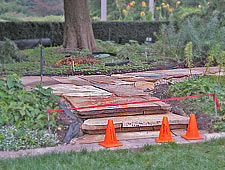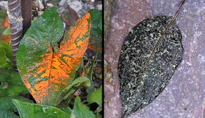 Late October-early November means the fall witchhazels bloom again. Right on schedule, here’s Hamamelis virginiana. I especially like these first blooms because they camouflage themselves among the orange and golden leaves. New flagstone walkways are being installed in this botanical garden. They snake their way through the expansive beds that used to belong solely to spring bulbs and the knobby knees of the monumental bald cypress trees (Taxodium distichum) that line the garden’s central axis. Flora, my gardener’s encyclopedia, says that bald cypress trees that grow in swamps develop knees that poke out of water so that they can get the oxygen their roots need to breathe. The bald cypress trees growing here are on dry land though and their underground root system seems to working just fine without needing lots of knees. Yet, these trees still do develop a few knees. Before putting in the walkway the keepers of the garden must have had an interesting discussion about whether the knees that would be cut to lay the flagstones were vital to the health of the trees or were just some genetic holdover that have no known function for trees growing on solid ground. I looked at some pictures of this botanical garden taken fifty years ago and these bald cypresses were sizeable even then. Let’s hope the keepers who gave the o.k. for the walkways to be put in made the right decision.![]() This is not picture of a new variety of caladium with neon orange markings. It’s just a leaf that was in the way of a worker who marked the edges for the new walkway. And this green leaf with black mottling is one that somehow got sprayed with oil and then splattered on by the rain. A few of the reblooming irises have finally opened. This one is named ‘Licken.’ Irises called rebloomers don’t always perform as advertised. The Reblooming Iris Society (RIS) urges patience: if the irises don’t rebloom this season, wait until next year the mantra of every losing baseball team. Why don’t the rebloomers perform consistently? The RIS says it might be that they aren't old enough. Or then again, maybe the summer nights were too hot or the winter too cold. Could be they were watered too little or that the microclimate around the plant was all wrong. The Reblooming Iris Society says that it has 450 members. I’m sure there’s not a pessimist or a quitter in the bunch.